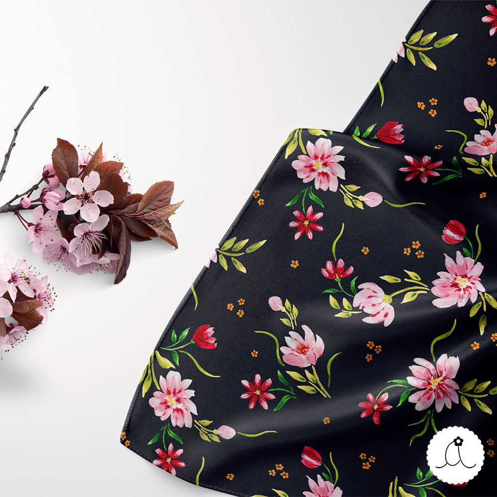This seamless pattern contains abstract flowers painted in acrylics and is: