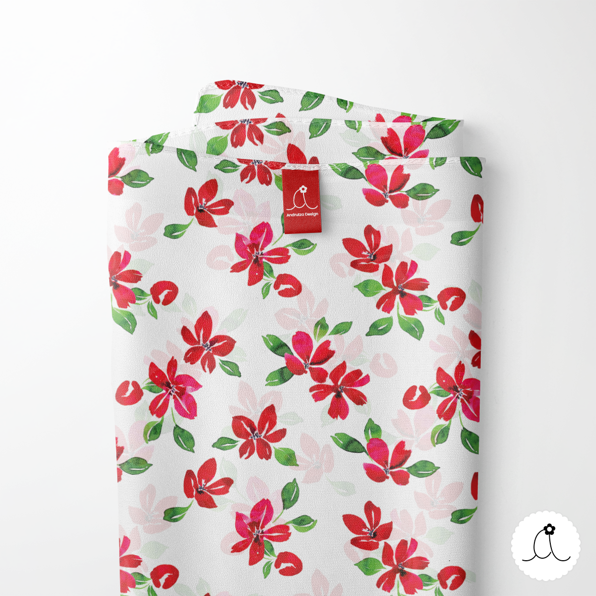 Seamless pattern with red flowers and green leaves drawn in an abstract way in watercolor.